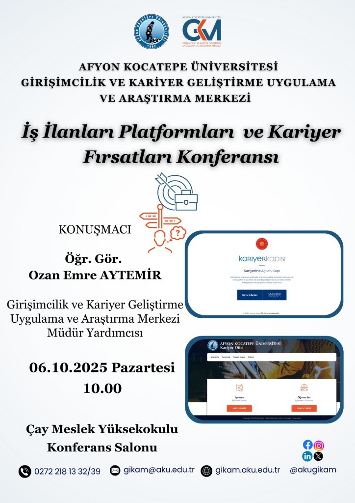 Girişimcilik ve Kariyer Geliştirme Uygulama ve Araştırma Merkezi Müdür Yardımcısı Ozan Emre AYTEMİR tarafından Meslek Yüksekokulumuz Konferans Salonunda 06.10.2025 Pazartesi Günü Saat 10.00 ‘da Kariyer toplantısı ve Merkez Tanıtımı yapılmıştır.